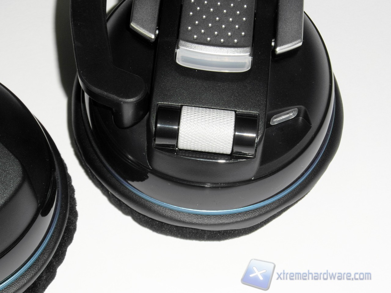 In mezzo, un grande pulsante permette l'accensione delle cuffie, mentre il LED sottostante ci riporta lo stato di connessione con la scheda audio USB. Vicino al connettore micro USB dedicato alla ricarica è inoltre presente un LED che indica lo stato di ricarica delle cuffie.