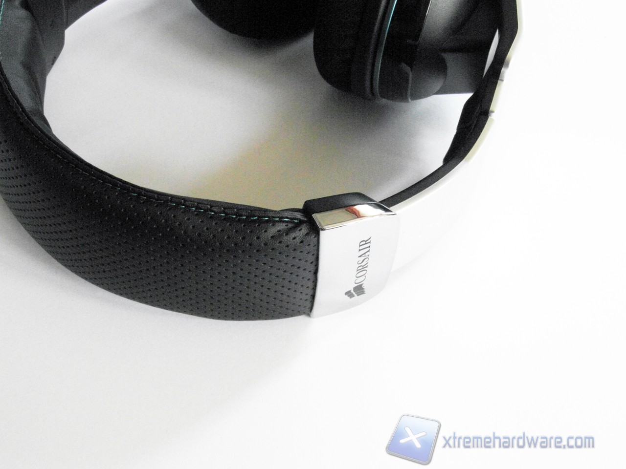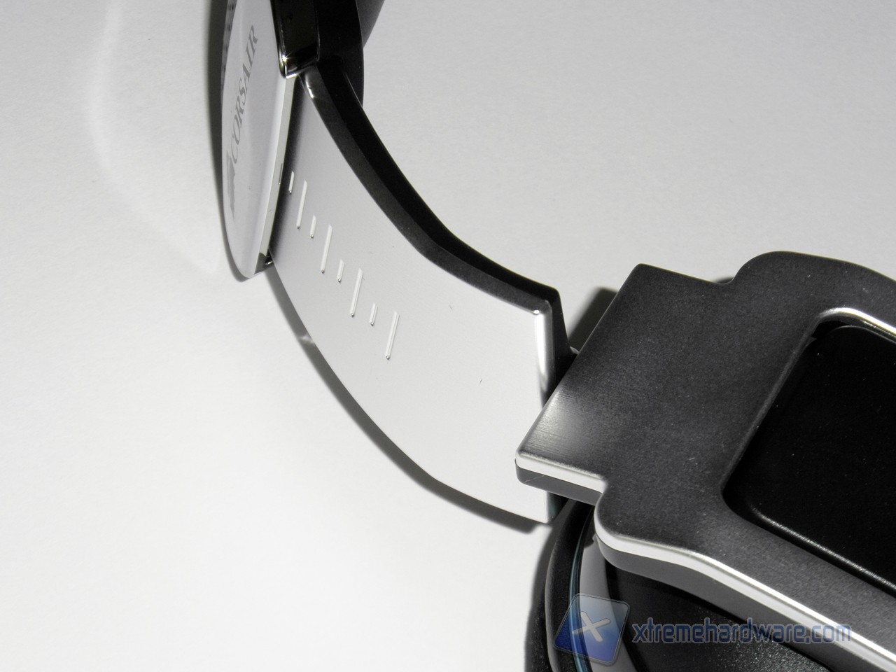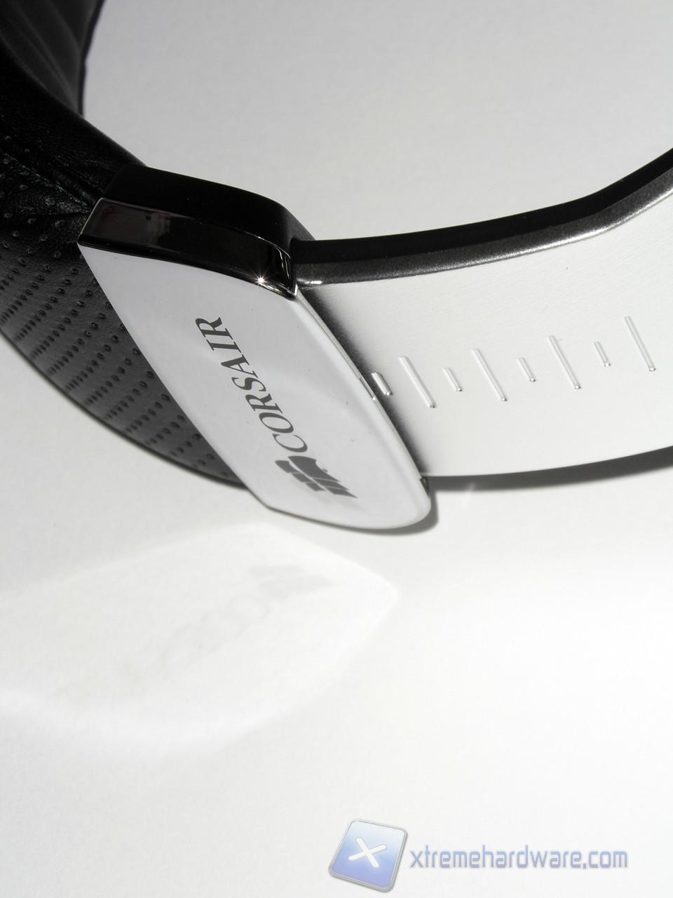 L'archetto superiore, accuratamente imbottito e cucito (molto curata la costruzione anche nei piccoli dettagli) è terminato da due placche cromate riportanti il logo Corsair, da qui partono le appendici estensibili delle cuffie che permettono una regolazione  a10 livelli differenti.