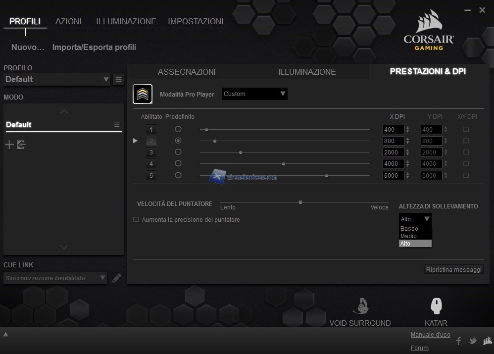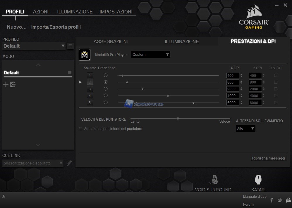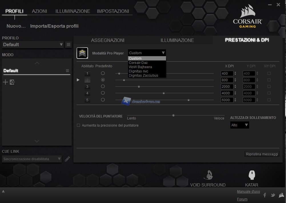 Procediamo con ‘’Prestazioni’’. Menù dal quale potremo eseguire una customizzazione più approfondita relativa ai 5 Step DPI e relativa risoluzione DPI. Come vediamo avremo diversi slider che potremo spostare regolando i DPI o potremo direttamente scrivere nel rettangolo a destra il valore DPI di nostro interesse. In più essendo il KATAR dotato di una memoria On-Board ogni salvataggio effettuato ci permetterà di utilizzare il mouse anche su di un altro PC senza preoccuparci di dover reimpostare tutto. Da notare come seppur il KATAR sia un mouse Entry-Level avremo la possibilità di regolare il valore LOD e/o di caricare profili ‘’pre-collaudati’’ da alcuni dei giocatori facenti parte del noto Team Dignitas. Non ci aspettavamo davvero un grado così elevato di personalizzazione per un mouse di questa fascia.
