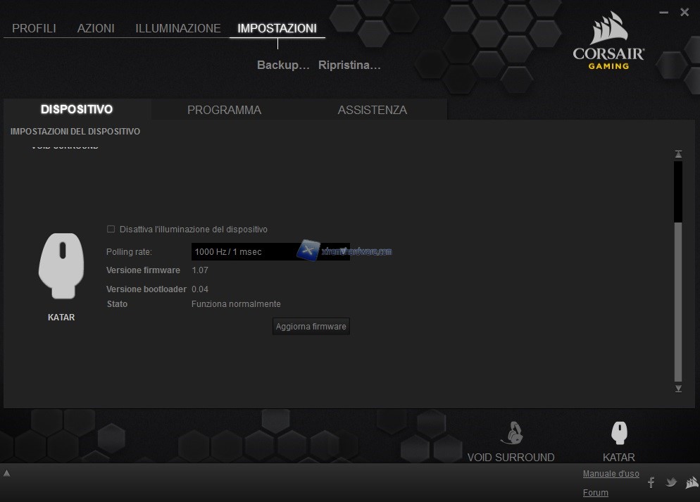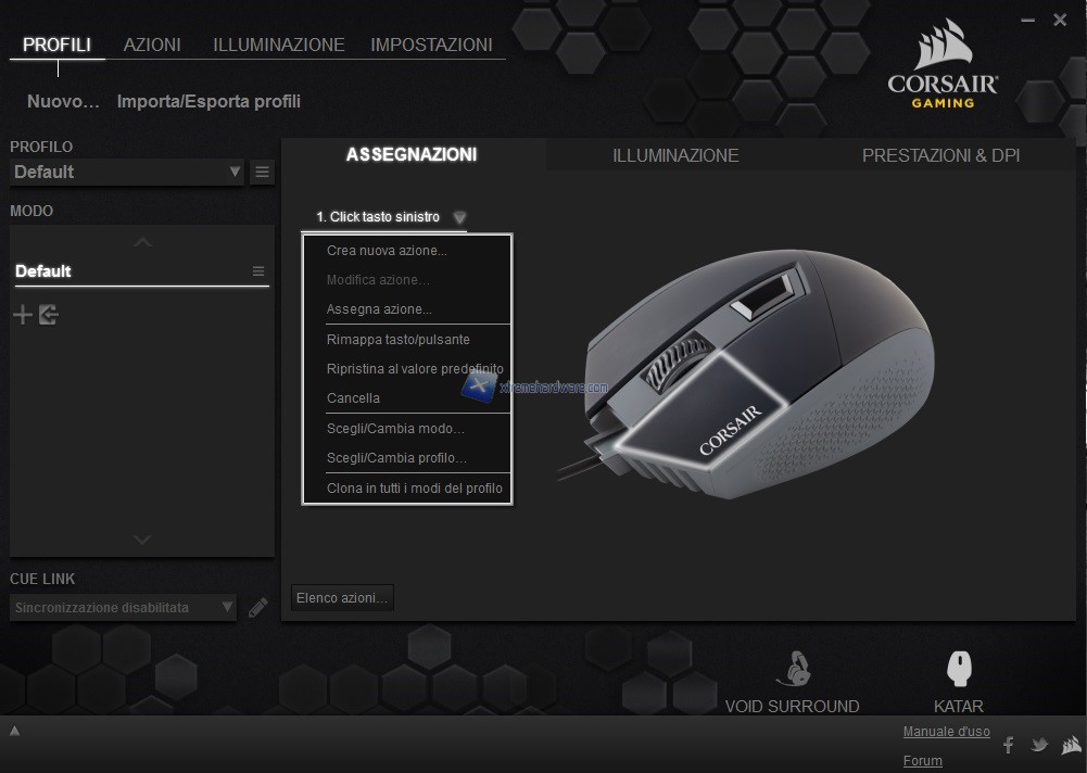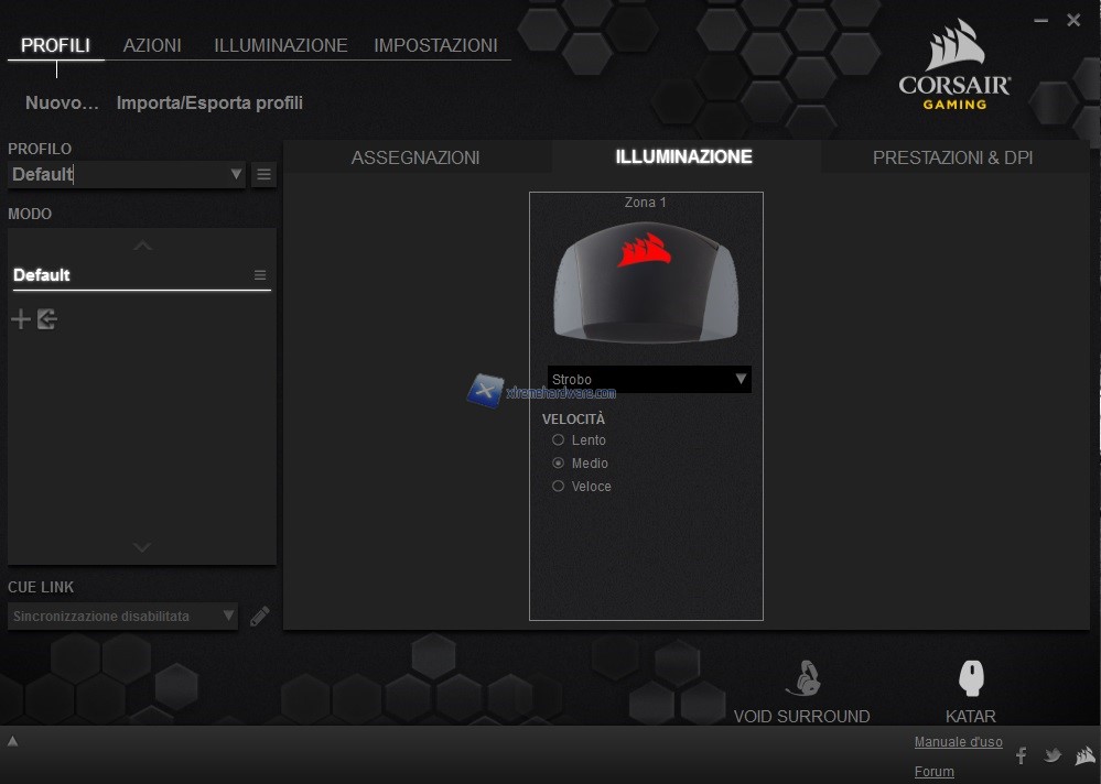 Come visto già con altri prodotti di Corsair Gaming recensiti, anche con il KATAR non è incluso alcun CD-ROM per cui dovremo collegarci al sito Corsair Gaming e prelevare il software CUE. Il Corsair Gaming KATAR di base non ha necessità di doversi o dover essere interfacciato con tale software infatti non esiste alcun link al software CUE per il KATAR. Dunque ci basterà prelevare l’ultima versione relativa alle tastiere della serie STRAFE o headset serie VOID per assicurare la rilevazione e compatibilità dello stesso.