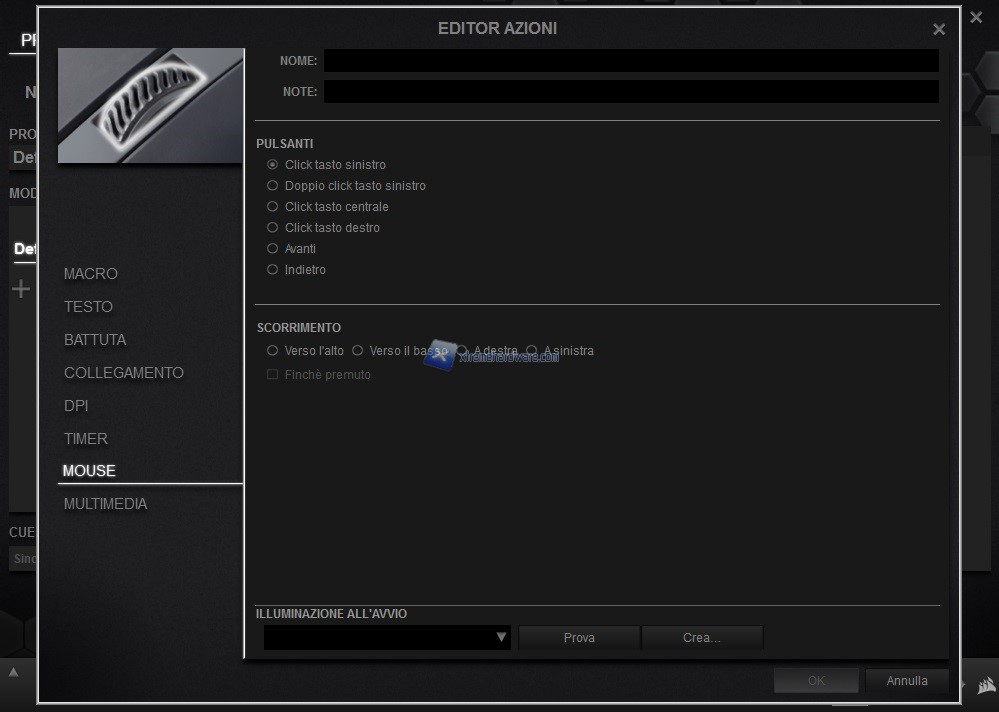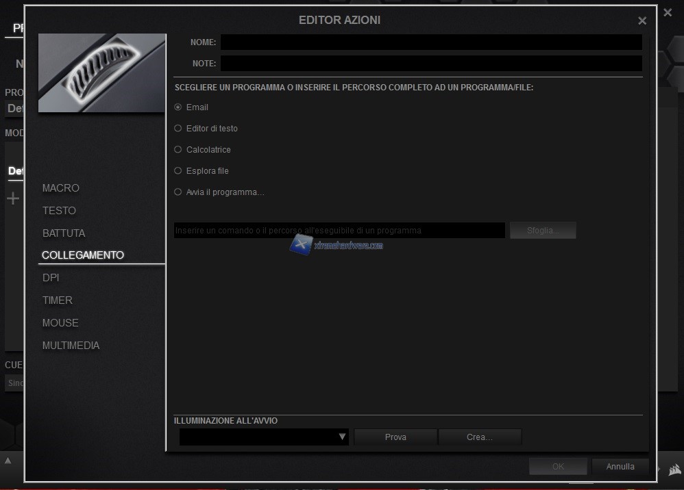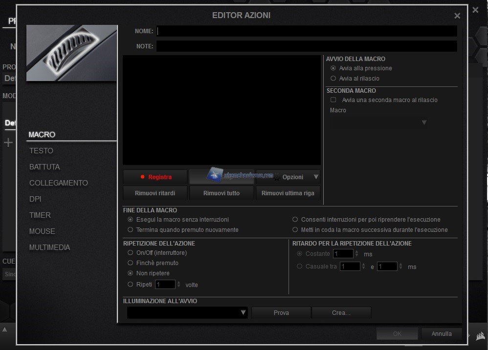 Partiamo dal Menù ‘’Profili’’ dal quale potremo creare, duplicare, editare e cancellare i profili creati. Notiamo anche come tale Menù ci permetta di accedere alle assegnazioni dei singoli tasti. Tramite questa funzione potremo rimappare un tasto che non utilizzeremo con un’altra funzione a nostro piacimento. Il Software di gestione di Corsair ha fatto passi così da gigante che potremo assegnare a quel tasto le più svariate funzioni, da una semplice Macro ad una più complessa o l’avvio di un programma, la digitazione di un testo con un singolo tasto e molto altro. Per chi è alle prime armi si troverà dinanzi un mondo, per come è possibile assegnare funzioni tramite il CUE.