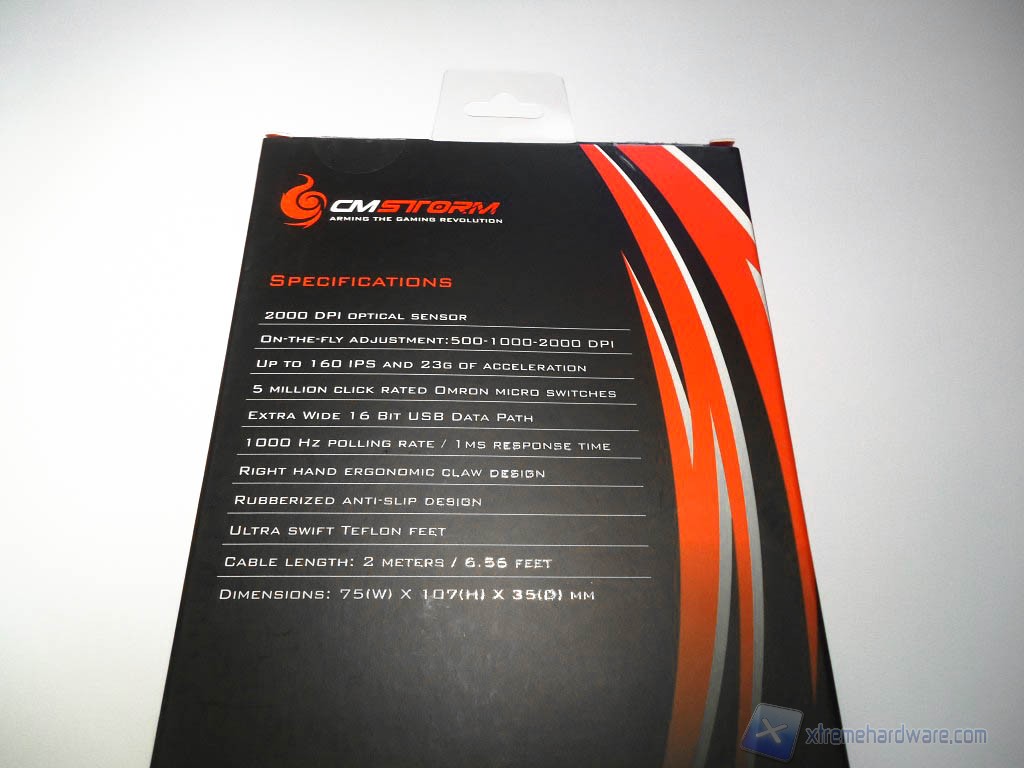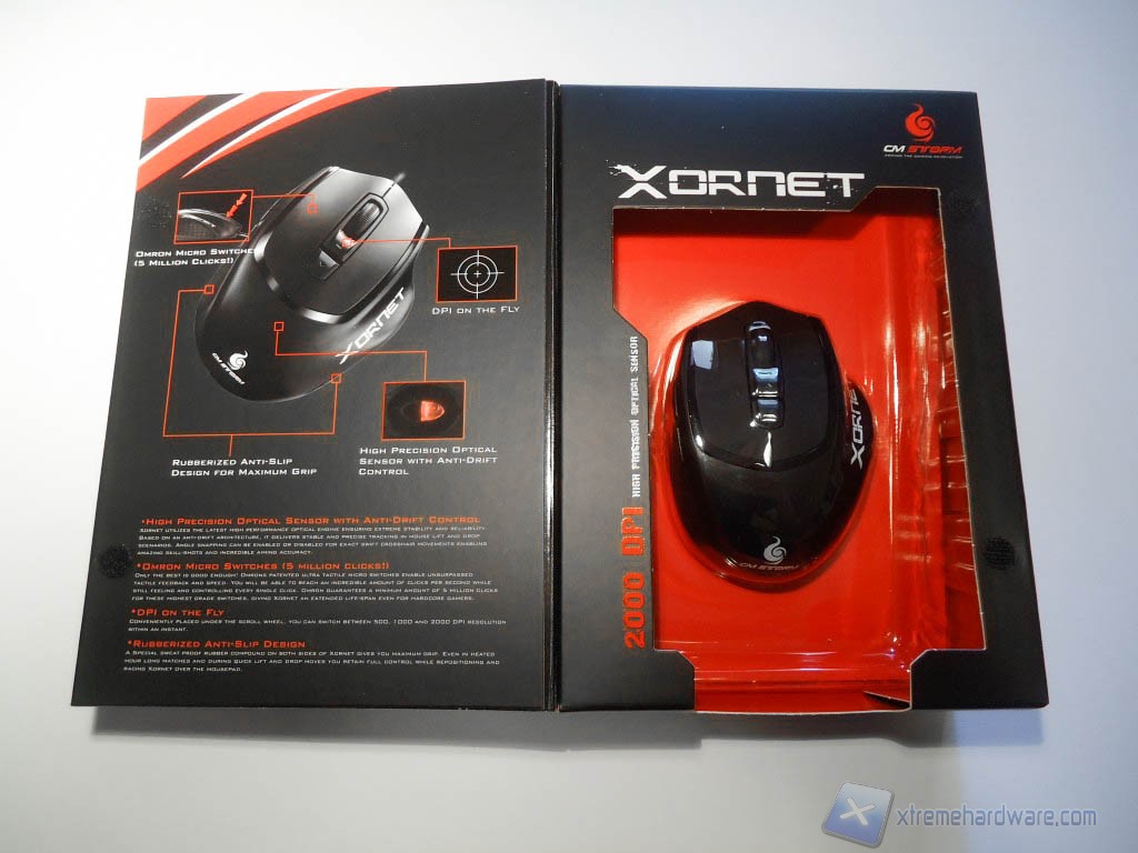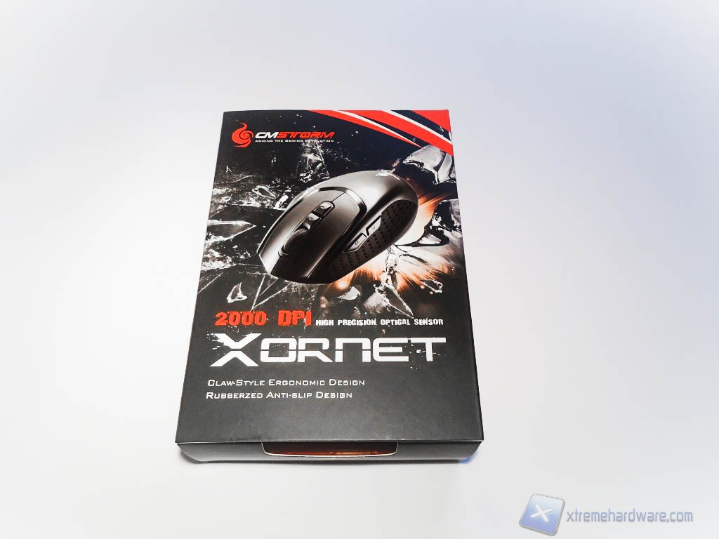 La scatola del CM Storm Xornet è molto curata e caratterizzata dai tipici colori del marchio CM Storm: rosso e bianco su sfondo nero.
