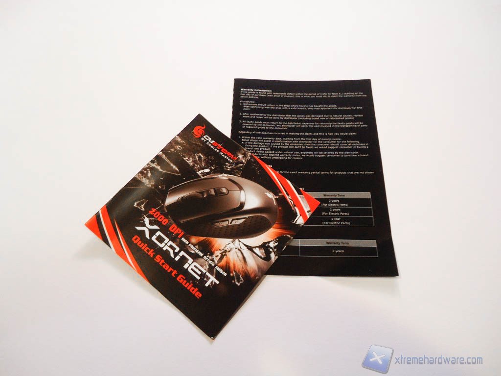 Aprendo la confezione, oltre al mouse troviamo anche il bundle, che come possiamo vedere dall’immagine è molto povero e comprende solamente un foglietto per la garanzia CM e un manuale illustrativo delle funzioni del mouse. La mancanza del CD per l'installazione dei driver è giustificata dall'assenza di un software dedicato e alla natura plug-and-play del mouse.