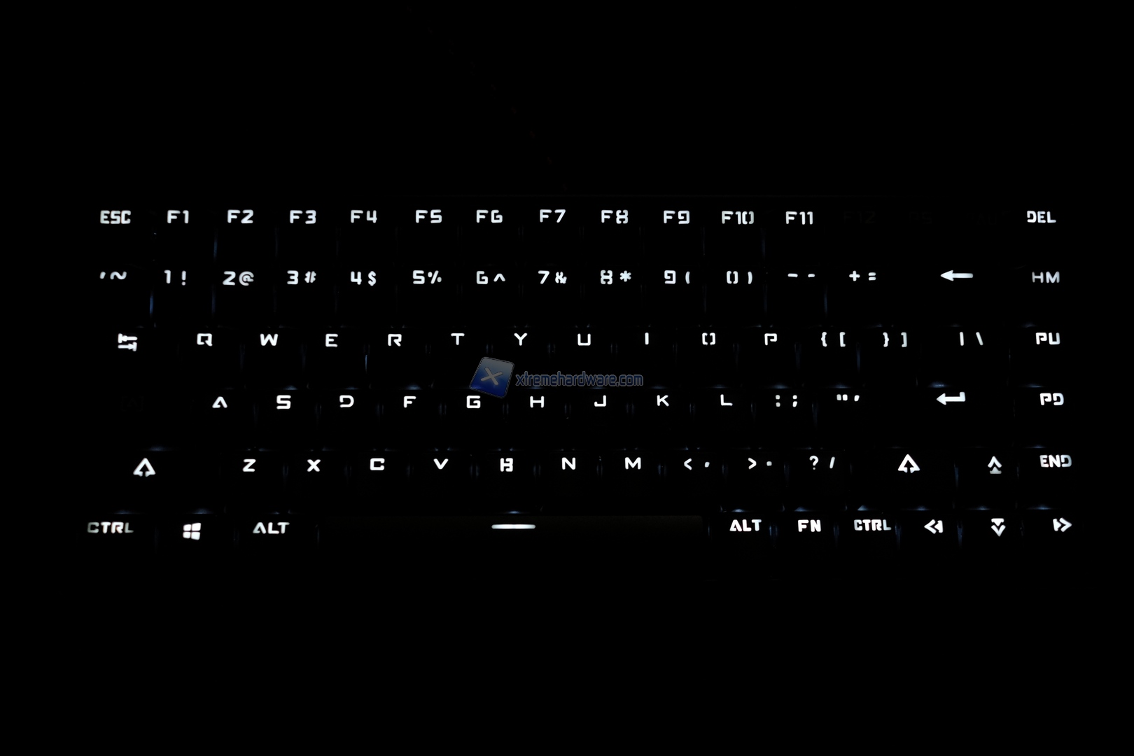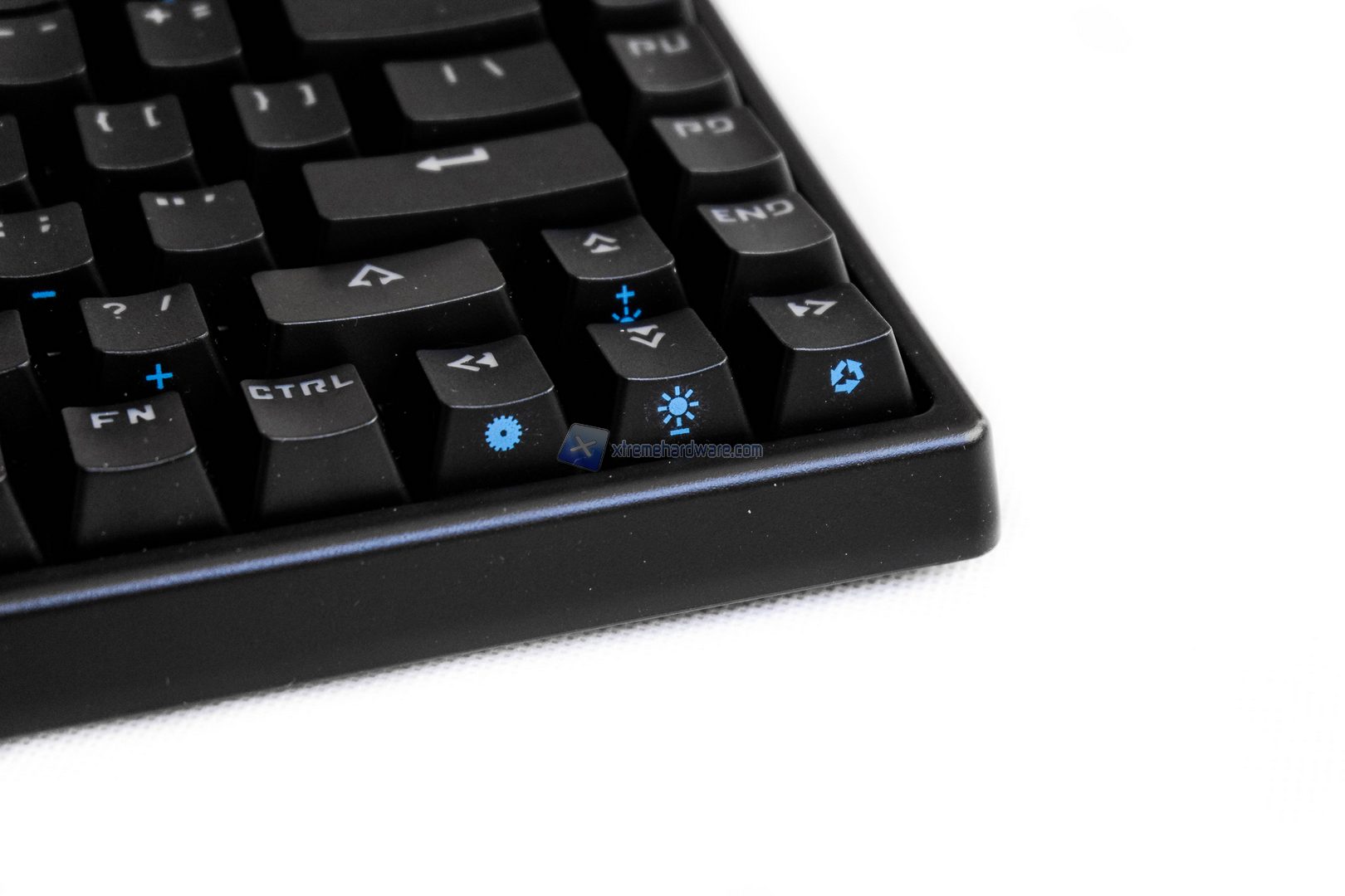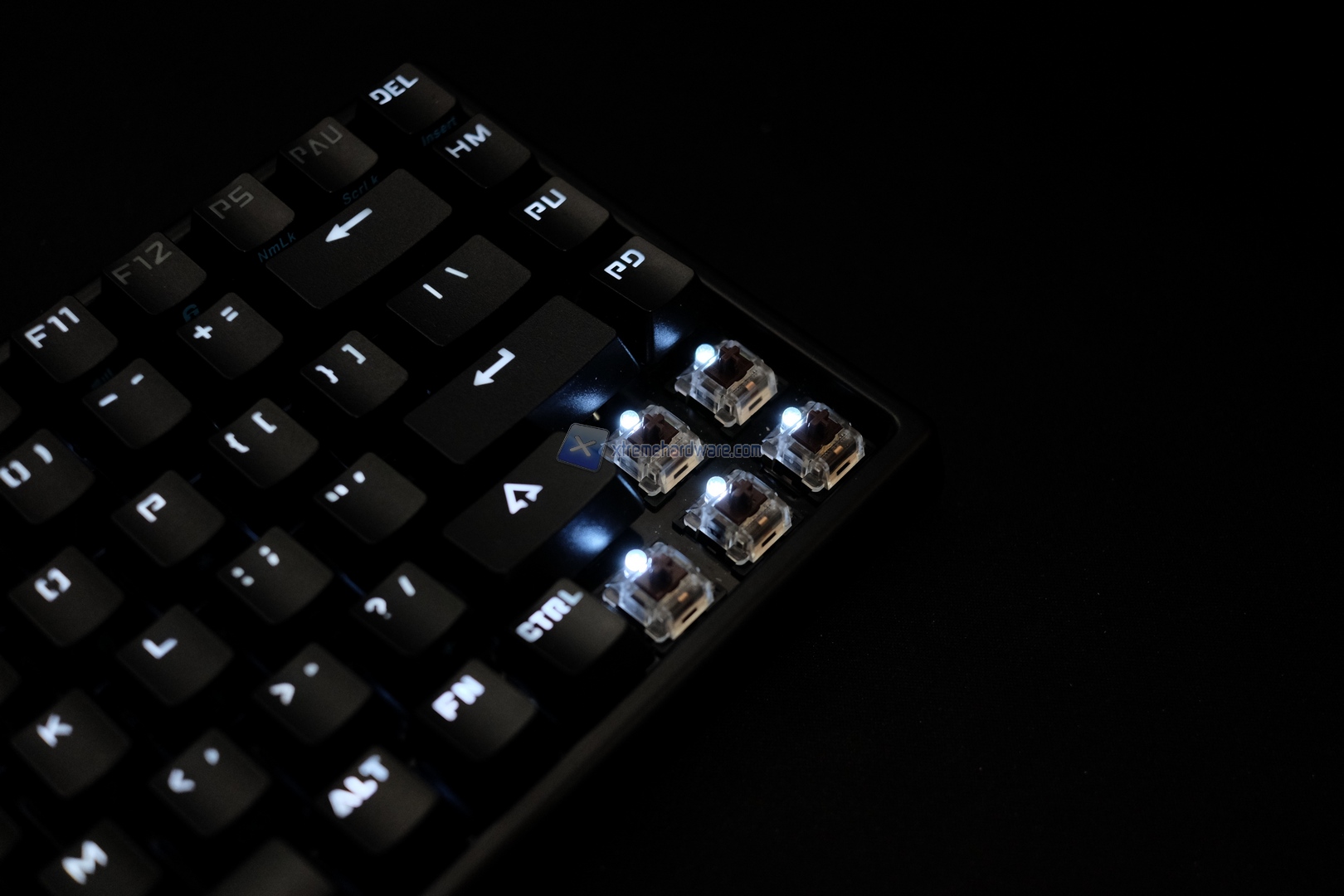 Gli switch meccanici che equipaggiano questa tastiera sono marchiati Outemu, i quali richiedono una forza di attuazione leggermente superiore, a parità di switch, rispetto ai Cherry MX. Ogni fila di tasti presenta un led di colore bianco, così da avere una retroilluminazione perfetta e davvero utile durante le ore notturne.