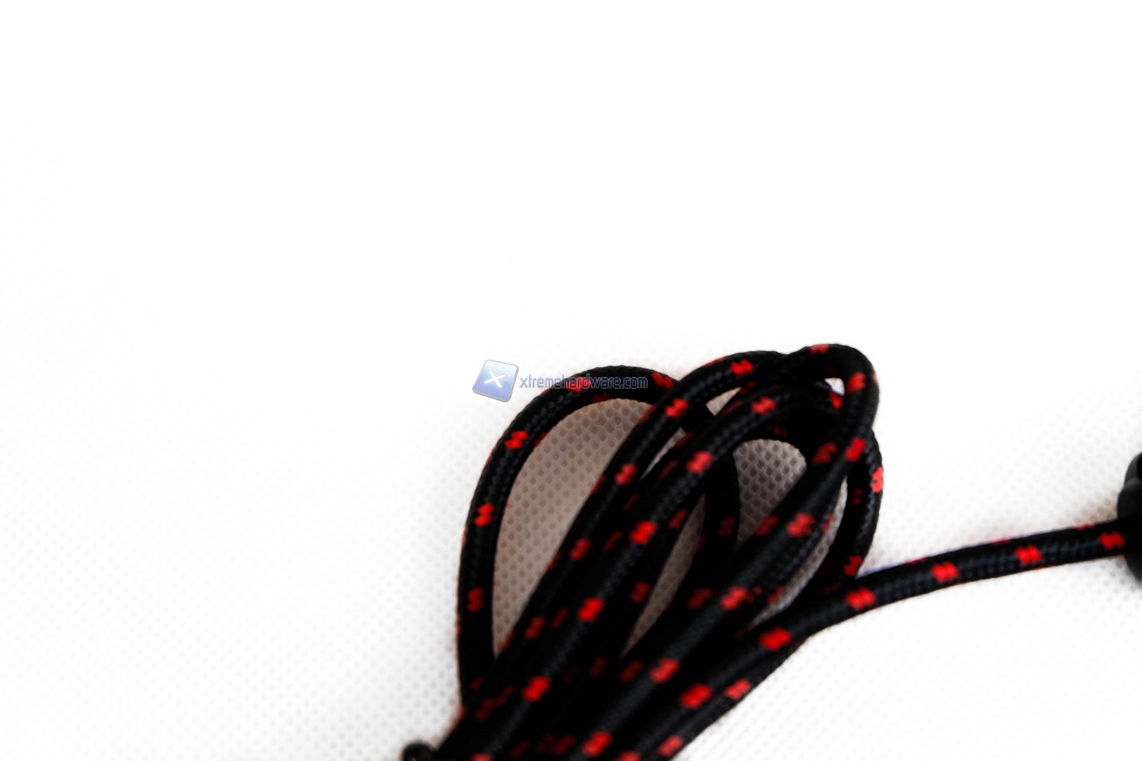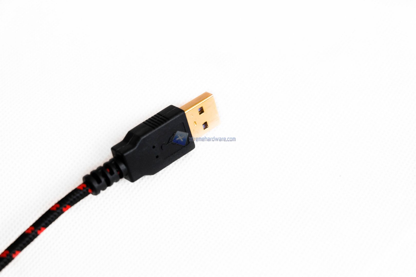 Infine troviamo il cavo e il connettore USB. Il cavo è rivestito in tessuto ed offre un’ottima resistenza a strappi e tagli, inoltre il connettore è placcato in oro per assicurare una migliore compatibilità con le porte della nostra scheda madre.