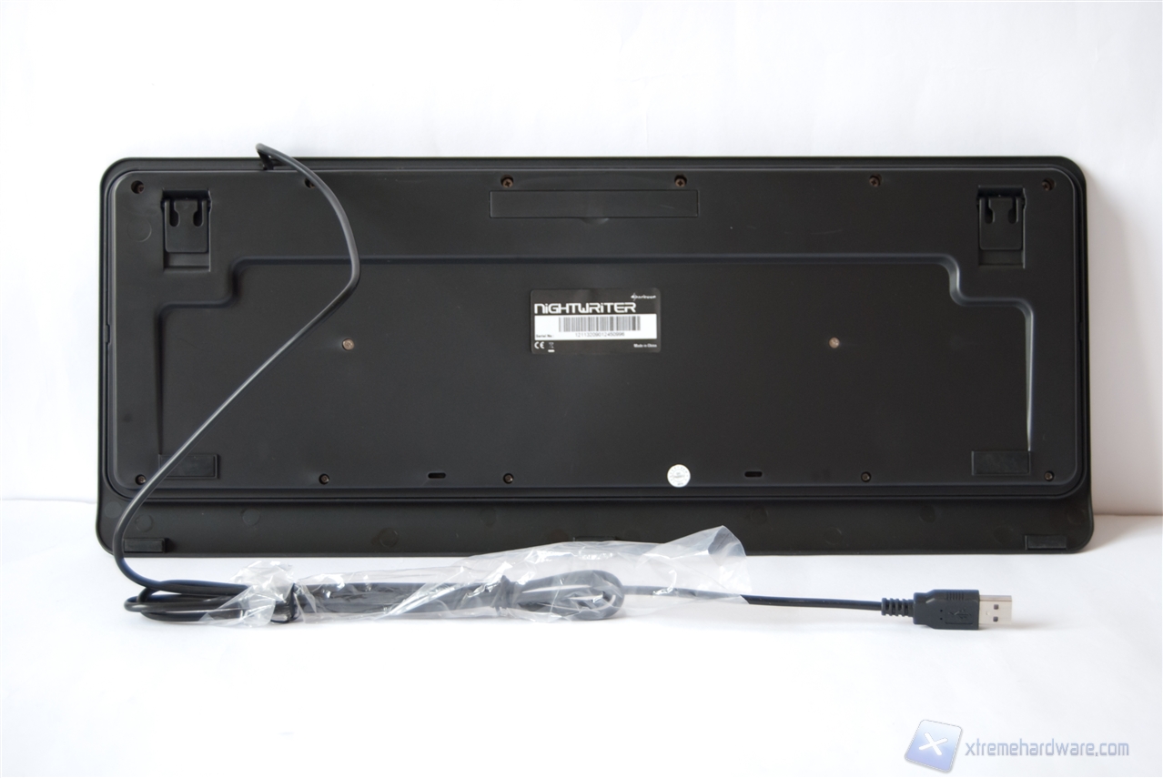 Il fondo presenta la classica etichetta riportante il nome del prodotto e il codice a barre, i due piedini per alzare la tastiera e ben 4 piedini di gomma antiscivolo di dimensioni differenti che svolgono egregiamente il proprio lavoro.