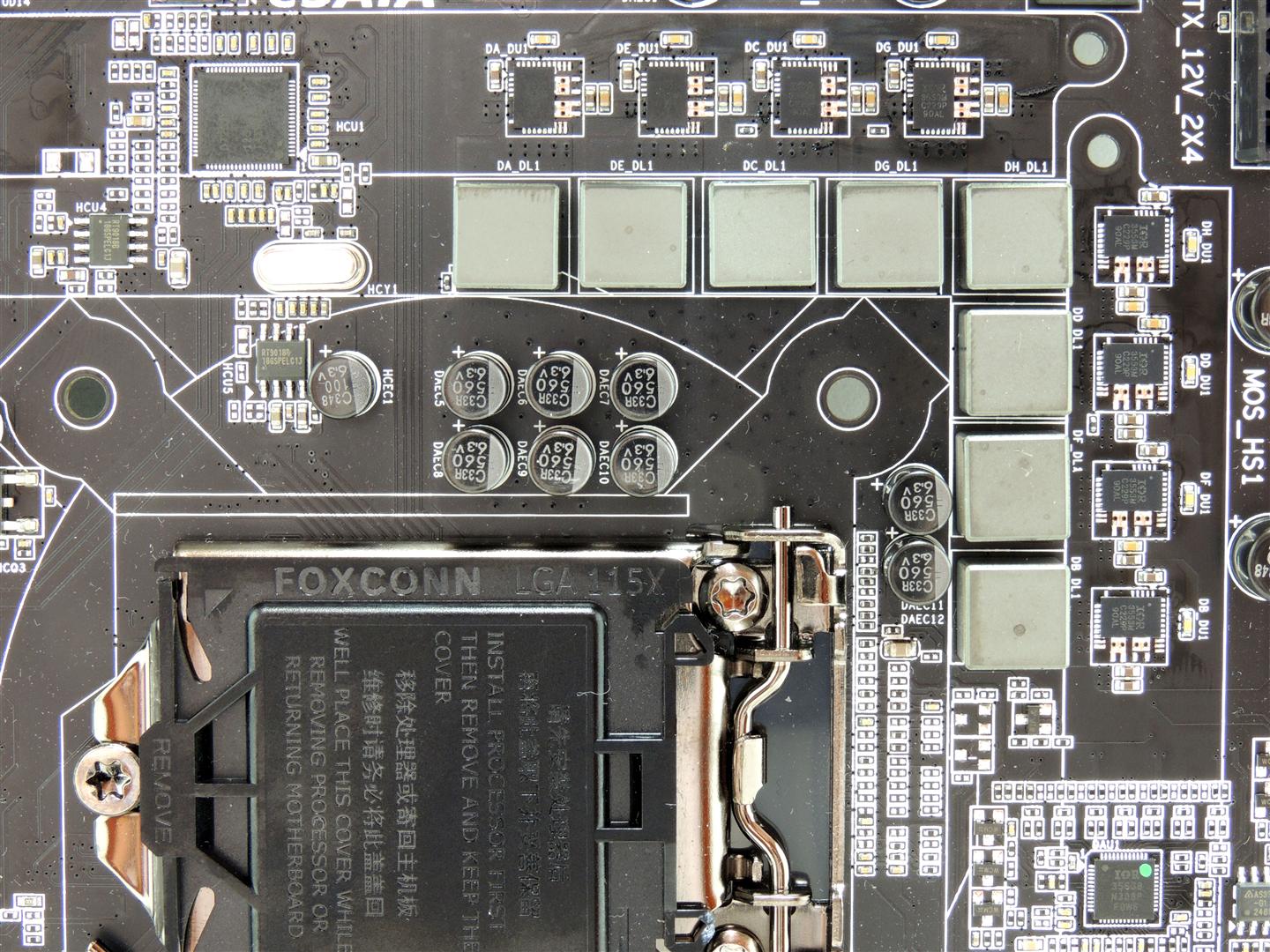 Nella zona socket distinguiamo il socket LGA1150, le 8 fasi di alimentazione ed i 2 dissipatori di calore privati dell’Heatpipe dove è rimasta l’impronta vuota. Ricordiamo che i PIN del socket LGA 1150 sono interamente placcati in oro in modo da evitare qualsiasi problema di isolamenti del pin con la CPU. Rispetto ai precedenti modelli di fascia media con chipset Z77, il dissipatore è di lunghezza maggiore: sebbene termicamente superfluo è sicuramente più gradevole alla vista rispetto ai precedenti dissipatori dimezzati.