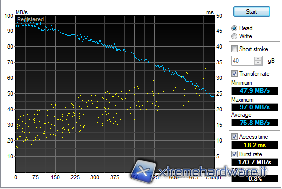 Analizzando i risultati possiamo notare una velocità sia in scrittura sia in lettura davvero elevata, non comune a questo tipo di dischi rigidi. In lettura abbiamo un average di ben 76,8 MB/s con access time di 18.2 ms. In scrittura abbiamo invece una velocità media di 73,8 MB/s con un tempo di accesso di 20.5 ms. Gli IOPS misurati invece sono piuttosto contenuti sia in scrittura sia in lettura.